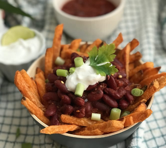 Dress up your starter or side dish! Our Oven Baked Sweet Potato Fries are the perfect base for the simply flavourful chilli made of kidney beans, tomatoes, and herbs and spices. Top with your favourite coconut yogurt and a few spring onions to delight your guests with a dish that'll keep them coming back for more!