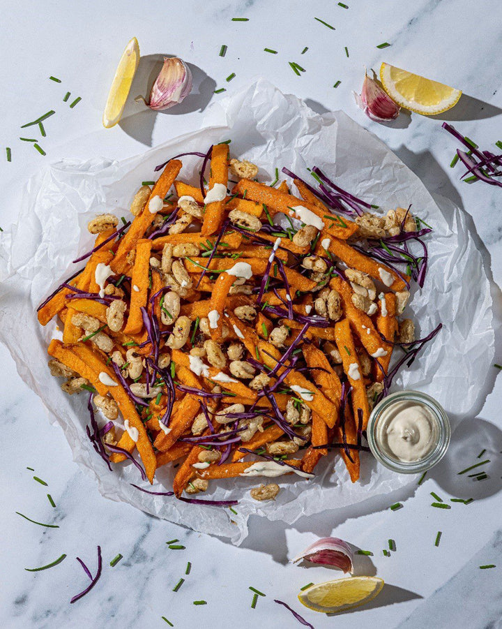 To assemble the fries, layer the beans and tahini cream on top of the sweet potatoes. Top with the cabbage and chives. Serve warm and crispy.