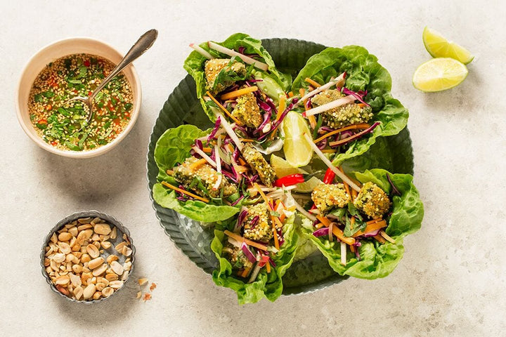 Cut the Pumpkin & Spinach Burgers into small pieces and add a couple to each lettuce cup.