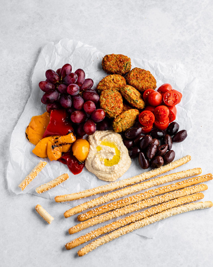 A simple combination of some of our favourite savoury bits served up sharing style on a mighty board or plate. Hummus, grapes, olives, roasted peppers, and some bread sticks for dunking. Our Spinach Bites take this charcuterie board to a whole other more satisfying level. From snack plate to meal in minutes.