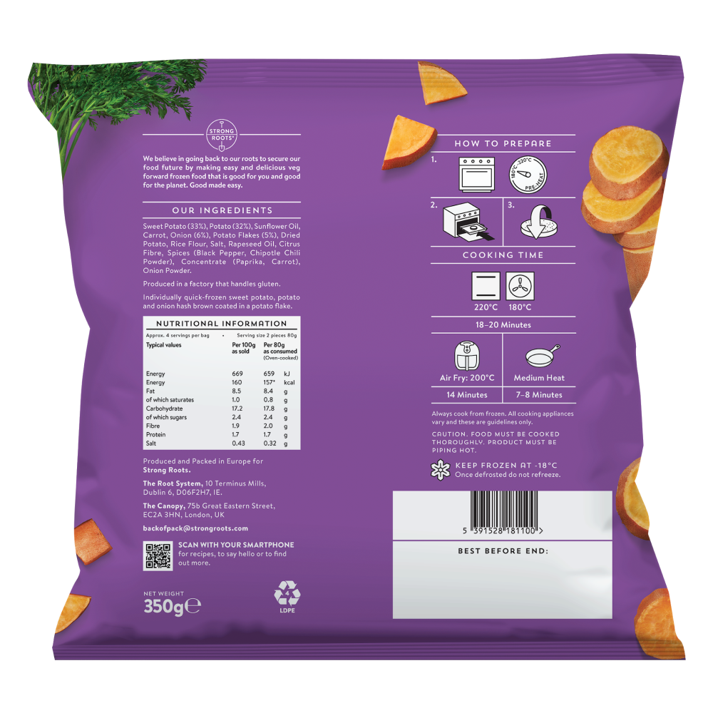 Our Sweet Potato Hash Brown is a savoury twist on a classic hash brown. They make for a tasty addition to any meal and are an excellent way of adding sweet potato to your diet. Made with natural ingredients and gluten free they are the G.O.A.T